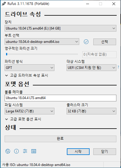 3. rufus를 사용해서 UEFI 모드로 USB를 우분투 설치 USB로 만든다.
