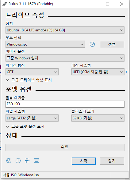 4. rufus를 사용해서 UEFI 모드로 USB를 윈도우 설치 USB로 만든다.