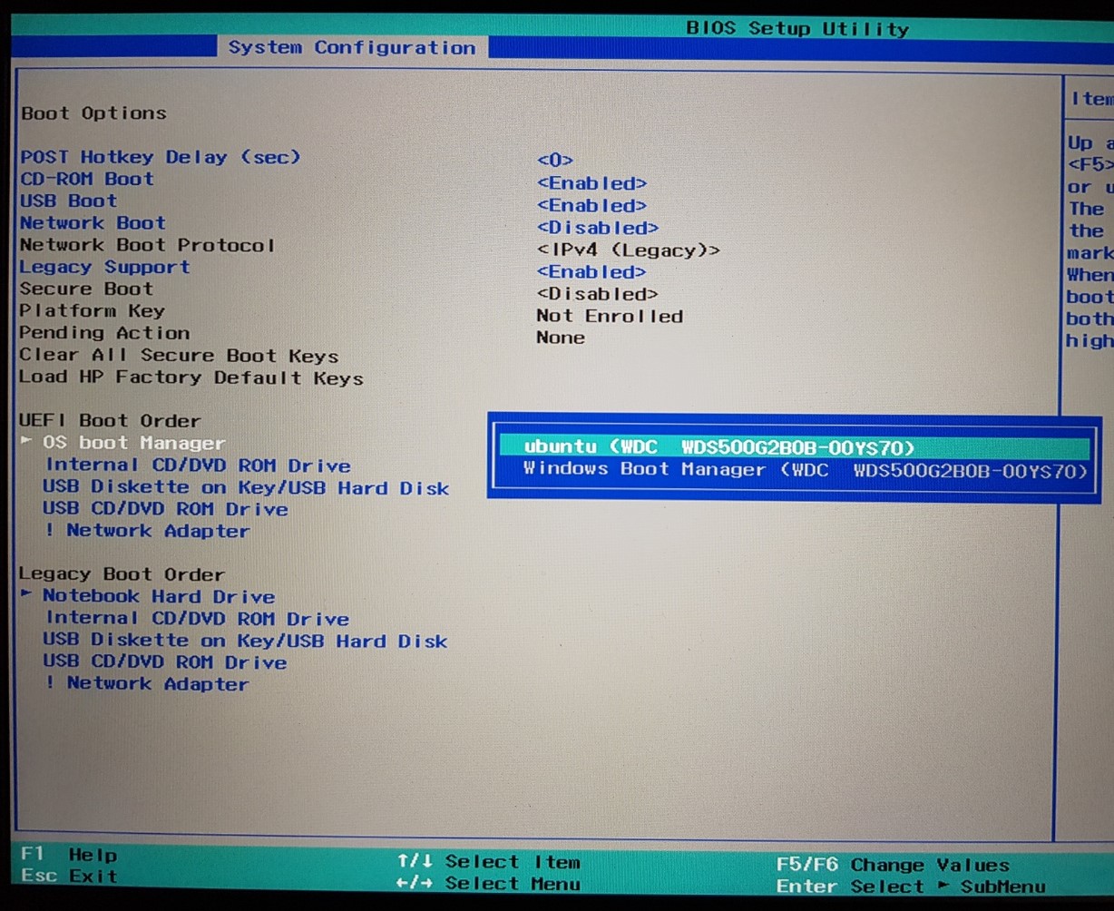 F10키를 연타해 바이오스에 진입 후 우분투 부트 매니저를 가장 상위에 설정해서 첫 번째로 실행되게 한다.