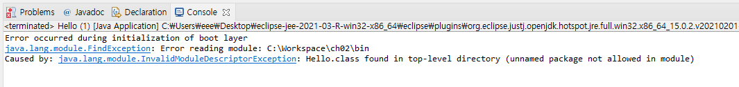 최상위 디렉터리에 Hello.class가 있다(모듈에서 이름이 지정되지 않은 패키지는 허용되지 않음)
