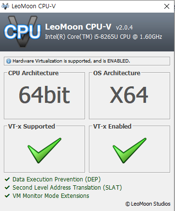 이 프로그램에서 다음과 같이 표시된다면 가상화 기능이 활성화 되지 않은 것 이다. 둘다 X 표시가 된 경우는 CPU 상에서 가상화를 지원하지 않는 경우이므로 불가능하다. VT-x supported에 체크 표시가 된 경우 bios에 진입해 가상화 옵션을 켜주자.