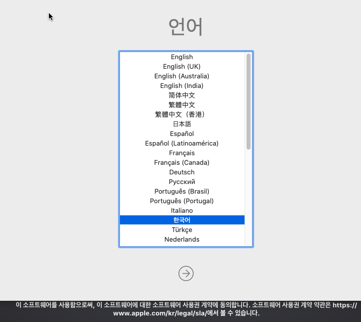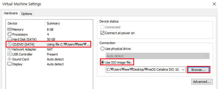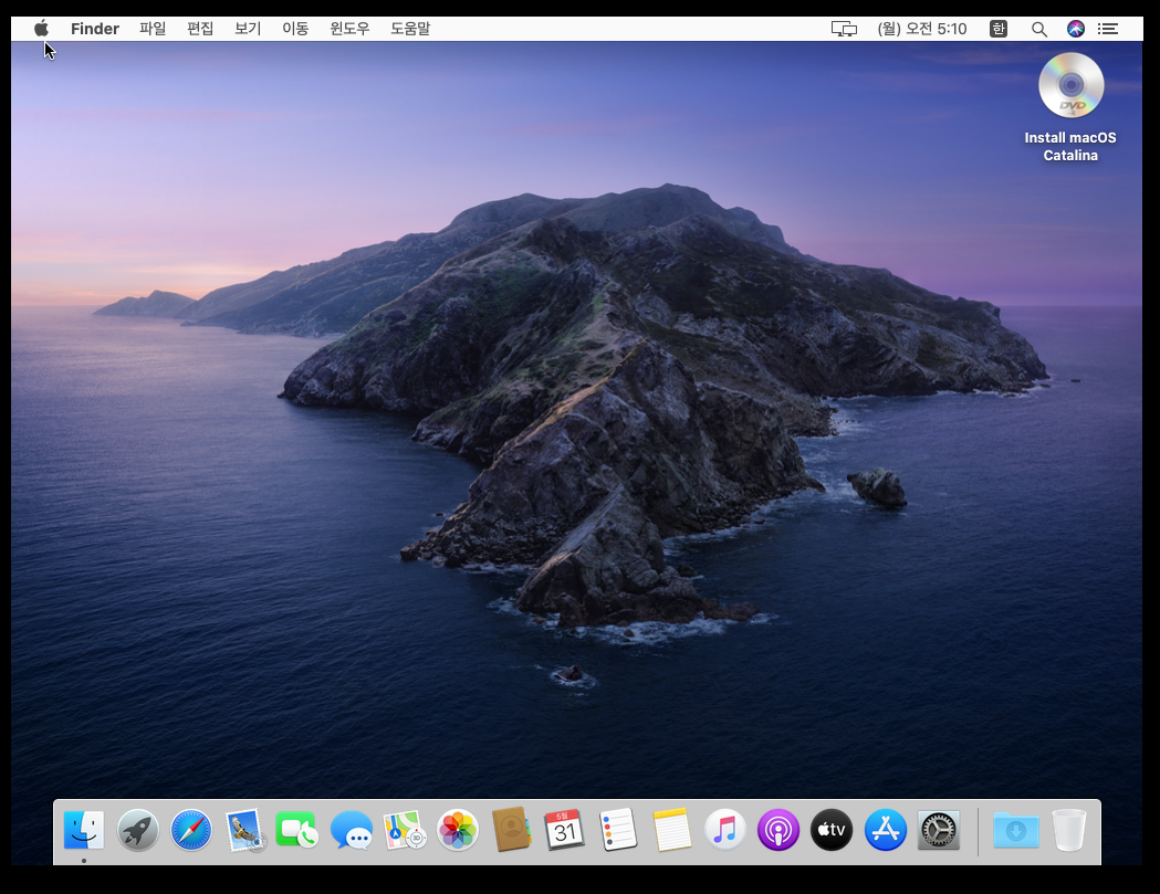 이로서 가상 OS 파일을 만들고 설정한 후 가상 부팅 시디롬에 맥 os iso 파일을 넣는 작업이 완료 되었다.
