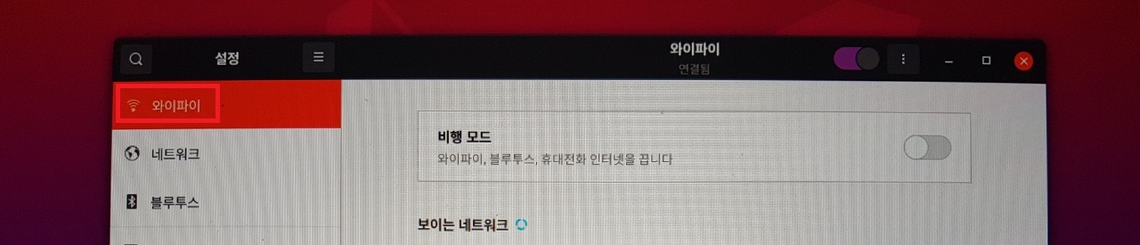 제대로 되었다면 설정 창에서 와이파이 항목이 새로 생겼을 것이다. 와이파이 드라이버가 잡히지 않으면 설정 창에서 와이파이 항목이 존재하지 않는다.