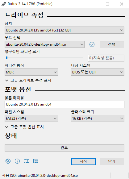 1. rufus를 사용해서 UEFI 모드로 USB를 우분투 설치 USB로 만든다.