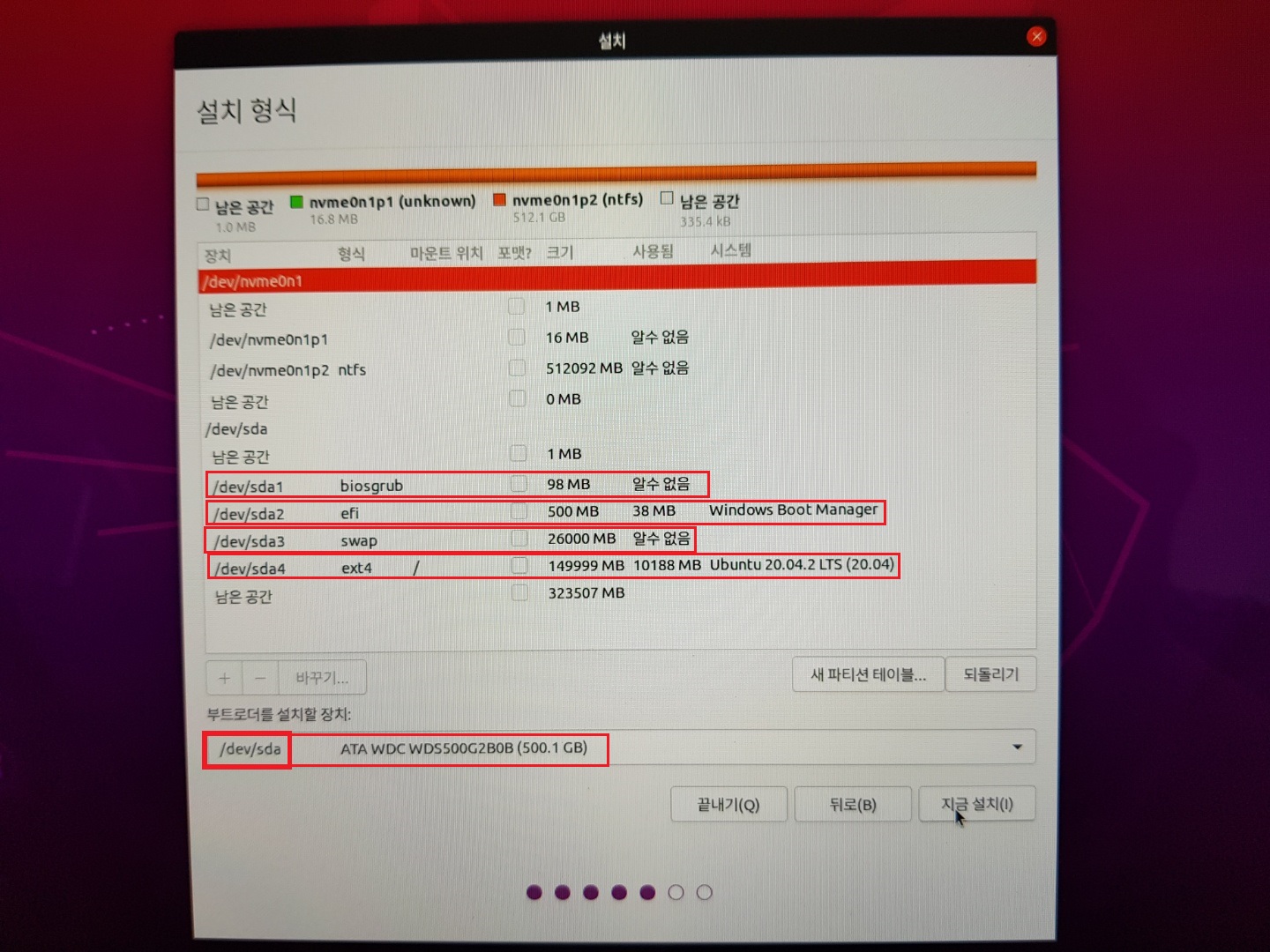 부트로더(grub) 설치 위치가 굉장히 중요하다. 윈도우 부분에 잘못 설치하면 윈도우 부팅이 안될 수 있고, 우분투 파티션 다른 곳에 설치하면 grub이 뜨지 않을 수 있다. 반드시 우분투 설치 보조기억장치(SSD) 최상위 맨 앞 파티션을 선택해서 설치하기 바란다.