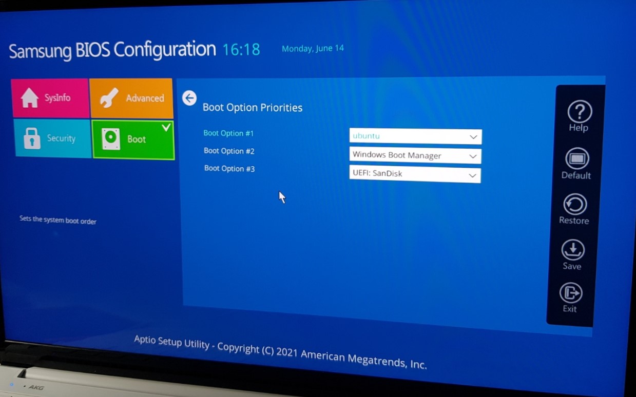 F2키를 연타해 바이오스에 진입 후 우분투를 가장 상위에 설정해서 첫 번째로 실행되게 한다.
