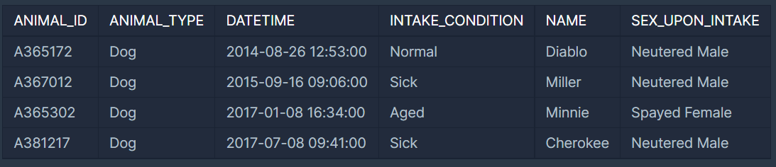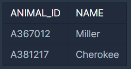 이 중 아픈 동물은 Miller와 Cherokee입니다. 따라서 SQL문을 실행하면 다음과 같이 나와야 합니다.