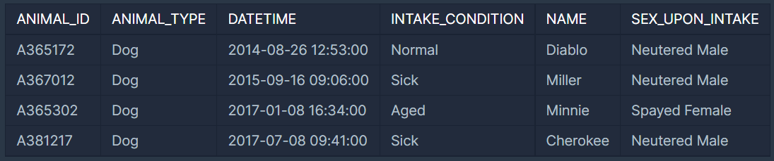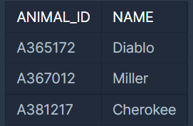이 중 젊은 동물은 Diablo, Miller, Cherokee입니다. 따라서 SQL문을 실행하면 다음과 같이 나와야 합니다.