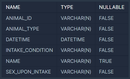 ANIMAL_INS 테이블은 동물 보호소에 들어온 동물의 정보를 담은 테이블입니다. ANIMAL_INS 테이블 구조는 다음과 같으며, ANIMAL_ID, ANIMAL_TYPE, DATETIME, INTAKE_CONDITION, NAME, SEX_UPON_INTAKE는 각각 동물의 아이디, 생물 종, 보호 시작일, 보호 시작 시 상태, 이름, 성별 및 중성화 여부를 나타냅니다.