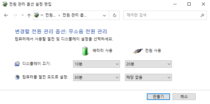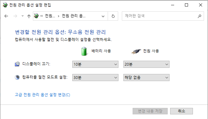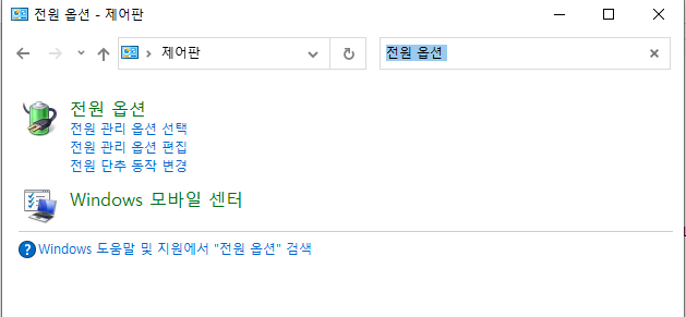 제어판에서 전원 옵션 검색, 전원 옵션 클릭
