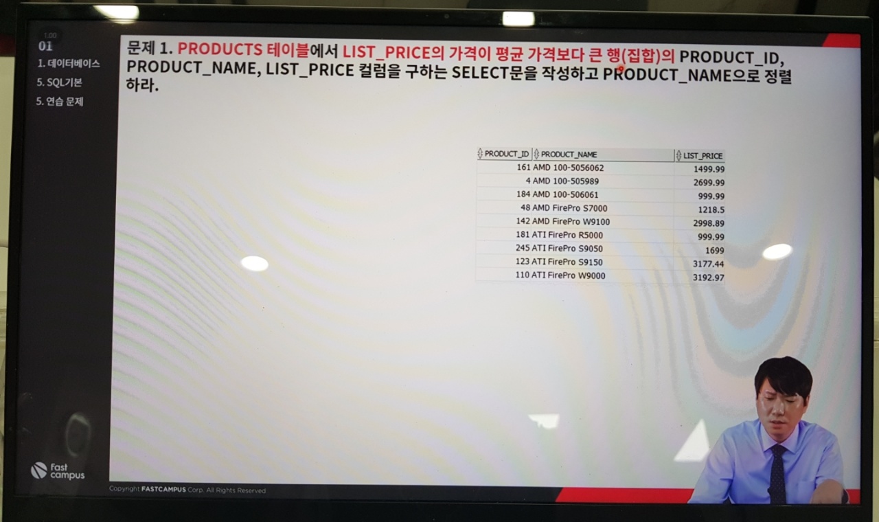 문제 1. PRODUCTS 테이블에서 LIST_PRICE의 가격이 평균 가격보다 큰 행(집합)의 PRODUCT_ID, PRODUCT_NAME, LIST_PRICE 컬럼을 구하는 SELECT문을 작성하고 PRODUCT_NAME으로 정렬하라.